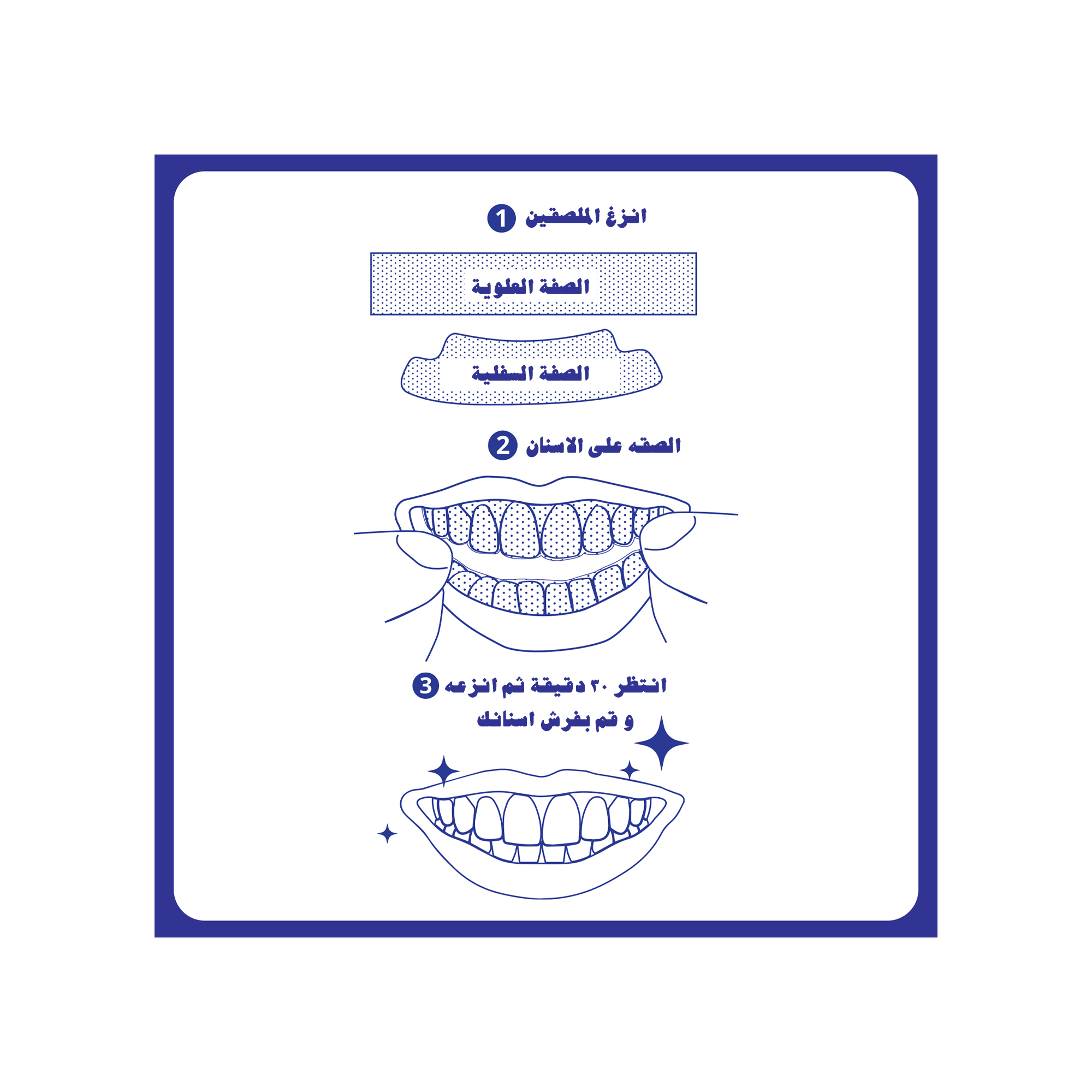 ينزع الملصق العلوي و السفلي، يلصق على الصفة العلوية و السفلية من الاسنان، انتظار ٣٠ دقيقة، يزال الملصق من الأسنان بعد ٣٠ دقيقة و من ثم يليه تفريش الأسنان و غسل الفم